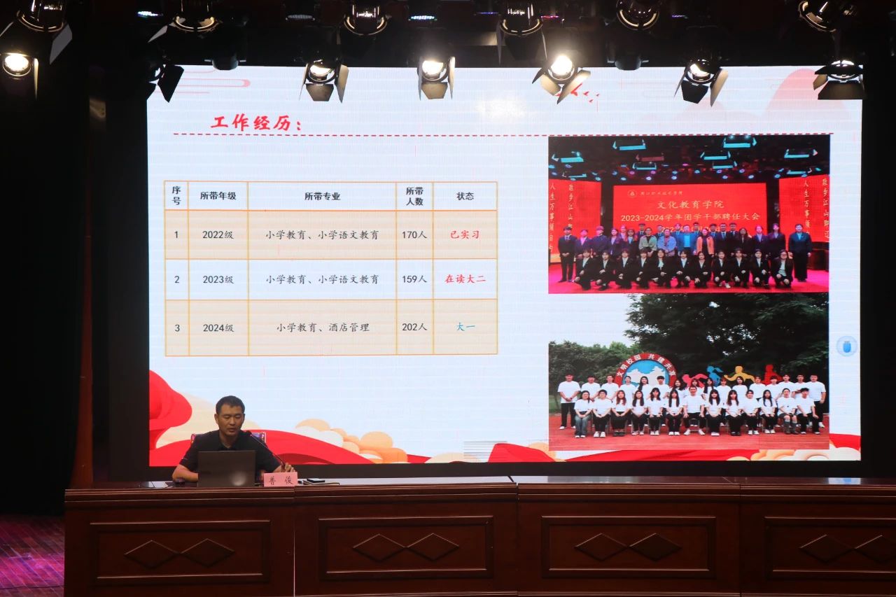 普俊首先向2024级新生介绍了文旅学院的基本情况、专业设置、师资力量以及近年来取得的成绩。接着,他从入学须知、学习应知、安全必知、成长认知四个方面,详细介绍了学生日常管理、寝室规章制度、国家资助政策、学习规划、团关系转接、第二课堂、安全注意等方面。鼓励新同学们追求卓越、勇攀高峰,利用好学校资源,努力丰富提升自我,积极主动参加活动,提升个人综合能力,促进健康成长成才。