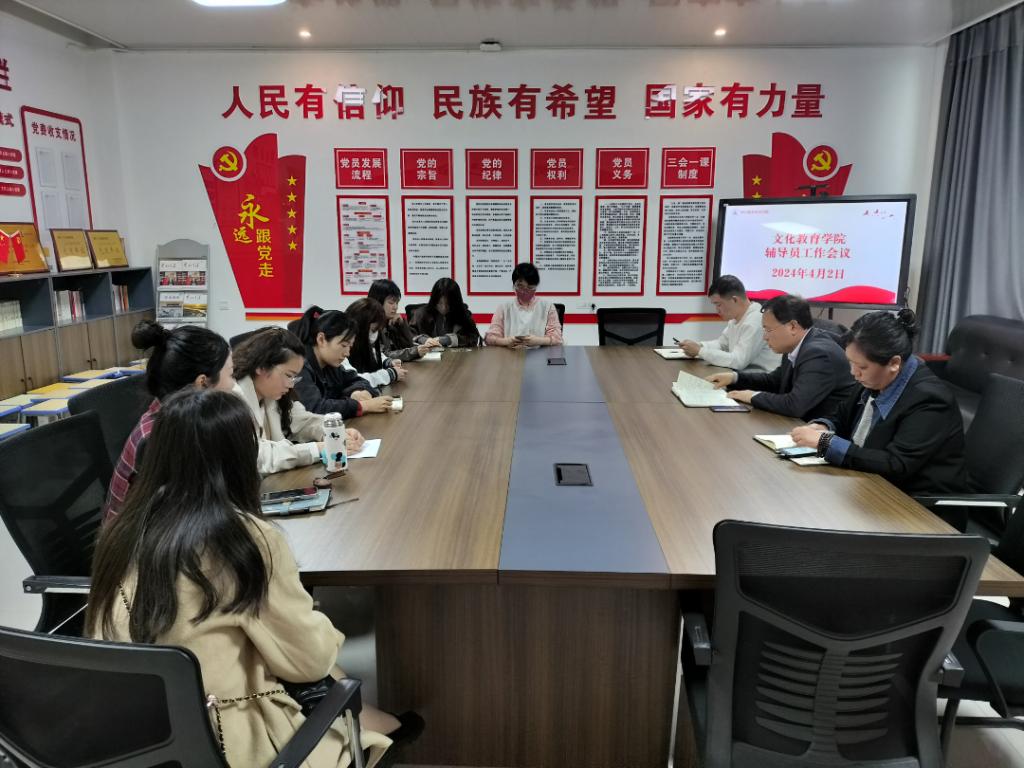 为进一步提升辅导员的工作技能、工作效率及假期学生安全问题,确保学院各项工作顺利开展,文化教育学院于4月2日在五区党员活动室召开辅导员工作会议,党总支书记展贤东,副院长于慧娟,学管办主任普俊及各班辅导员参加本次会议。
