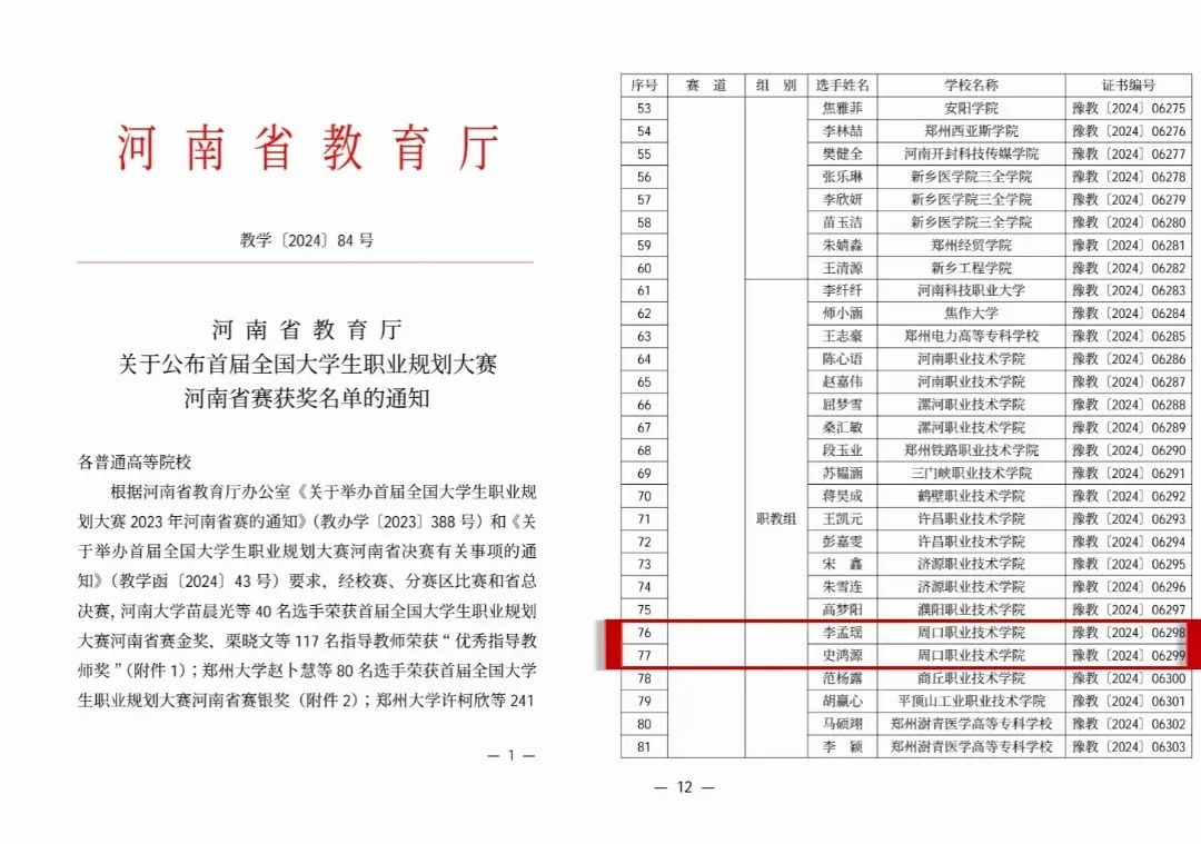 2024年3月28,河南省教育厅下发《关于公布首届全国大学生职业规划大赛 河南省赛获奖名单的通知》,文化教育学院22级人力资源管理01班史鸿源与23级小学语文教育05班李孟瑶两位同学获得成长赛道职教组铜奖。