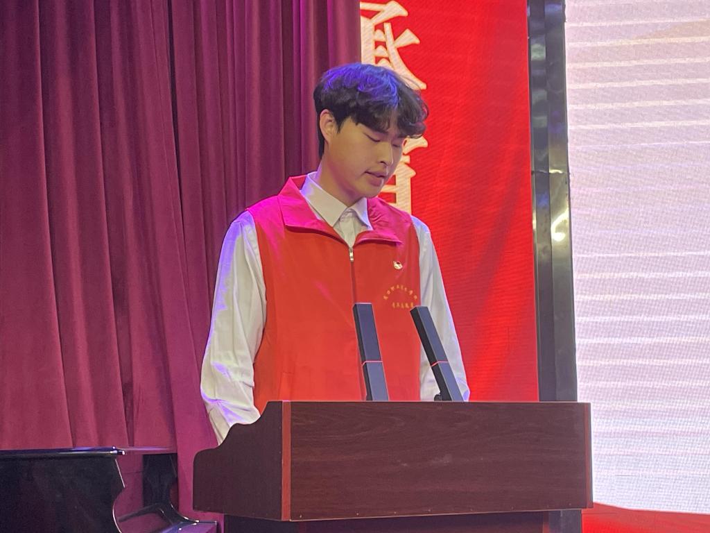在领誓人郭启航同学的带领下,在场全体青年志愿者举起右拳,庄严宣誓,神情专注,传递出对志愿服务的热忱与坚定,他们铿锵有力的誓言久久回荡在学艺演播厅内。
