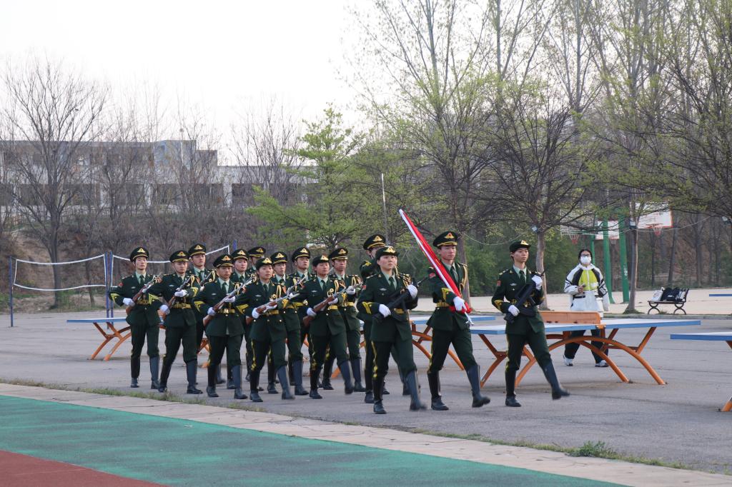 伴随着庄严的国歌声,国旗护卫队迈着铿锵有力的步伐护送着国旗,气宇轩昂地走向升旗台。鲜艳的五星红旗在全院师生的注目礼中冉冉升起。