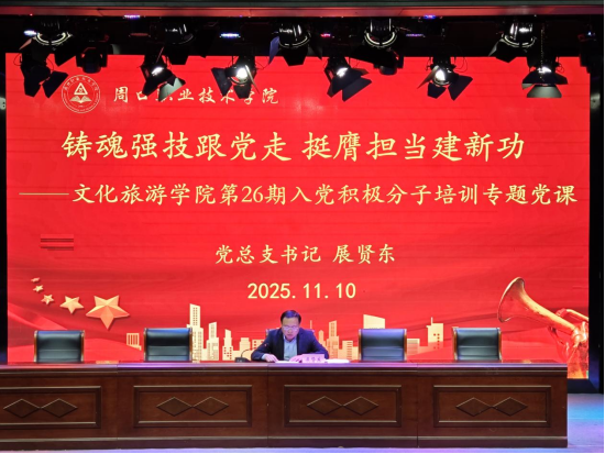 2025年11月10日,伟德国际唯一官网入口第26期入党积极分子培训班顺利开班。为加强入党积极分子培养教育,坚定青年学子理想信念,学院党总支书记展贤东以“铸魂强技跟党走 挺膺担当建新功”为主题,为学员们带来了一堂内容丰富、意义深远的党课。