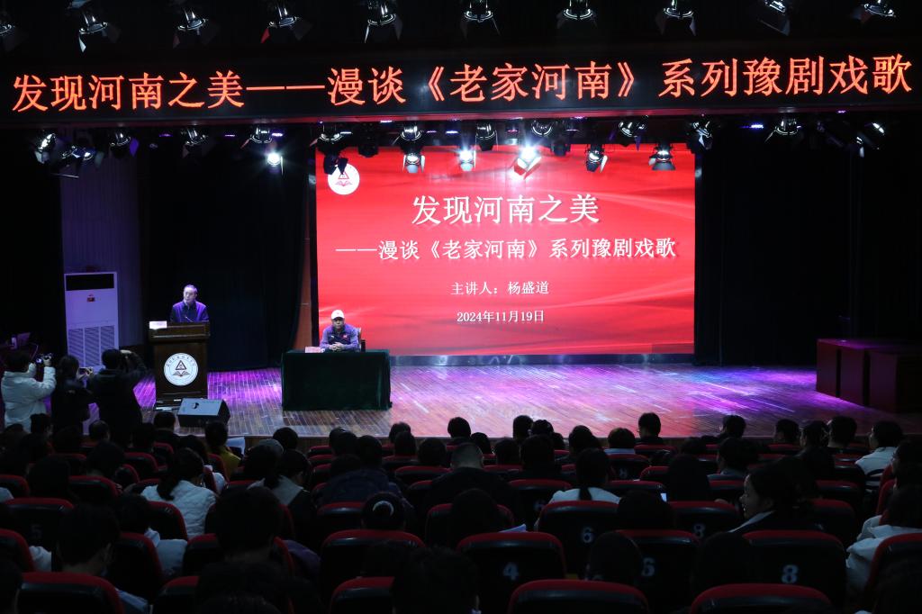 为了弘扬祖国优秀的传统文化,推进河南豫剧艺术的传承与发扬,加强同学们对豫剧的了解,以此更好地提升个人素养,坚定文化自信,凝聚中华民族共识,11月19日下午,BV伟德官方网站邀请河南大学客座教授、河南省文联专家指导委员会主任、原河南省委组织部副部长、人社厅厅长杨盛道教授在砺德厅开展“发现河南之美”——漫谈《老家河南》系列豫剧戏歌的讲座。讲座由校党委副书记,工会主席郭汝礼主持。伟德国际唯一官网入口党总支书记展贤东、院长史丽珍以及部分教师和学生代表参加本次讲座。
