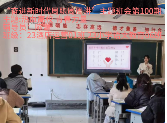 班会上,辅导员为同学们深入浅出地讲解了无偿献血的相关知识内容与对社会及他人的重要意义,让同学们对待献血的态度不再排斥。随后,辅导员也特别强调了献血对健康的积极影响,呼吁大家树立起责任意识,履行公民义务,发扬奉献精神,用实际行动践行新时代青年大学生的责任与担当,用涓涓热血传递爱与温暖。
