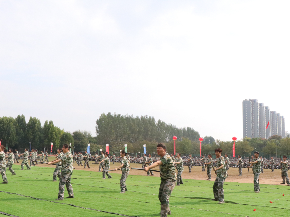 分列式汇报后,文化教育学院带来应急棍汇报表演,“棍长不过眉,身步要相随”,文教学子神采奕奕,势如破竹,棍棍生威。整齐划一的步法,刚劲有力的动作,展示着他们训练的成果。