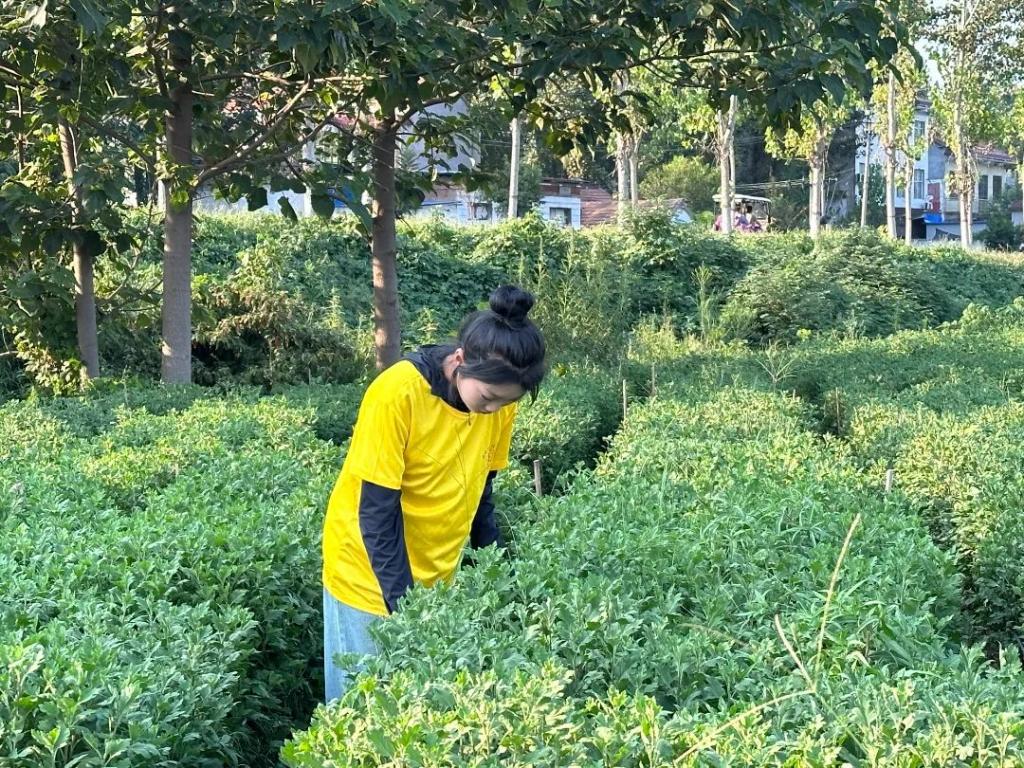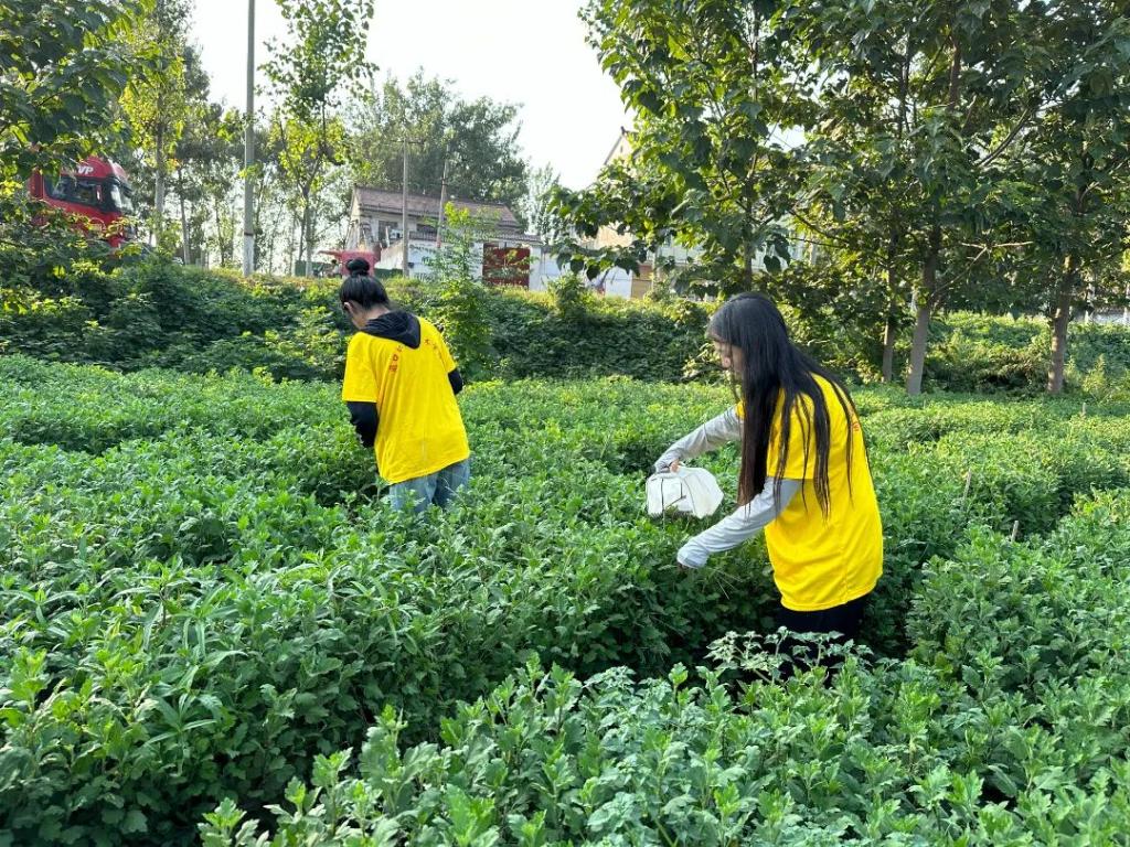 志愿者们精神抖擞、热情高涨、干劲十足。大家三五一组,既有分工,也有合作,挥锹挖穴,扶苗固土,修正浇水。志愿者们手拿剪刀与花农一起在田间修剪菊花枝节。通过修剪,可以有效改善架面通透性,同时避免枝条旺长浪费营养,有利于菊花更好的授粉开花。