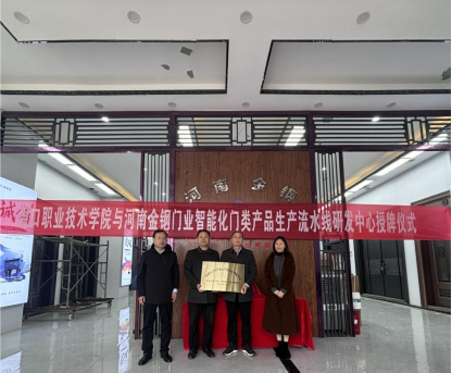 11月19日上午,伟德国际唯一官网入口与河南金钢门业股份有限公司在企业隆重举行“智能化门类产品生产流水线研发中心”揭牌仪式。河南金钢门业股份有限公司总经理杨凯、伟德国际唯一官网入口党总支书记展贤东、院长史丽珍、副院长李炯等学院领导出席仪式,共同见证了这一重要时刻。